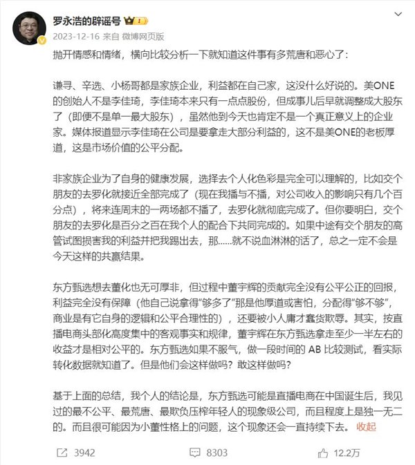 在2023年,罗永浩发长文 示意,东方甄选 定然会 接续推动“去董宇辉化”,由于假如只不过靠董宇辉一个人赚钱, 无论分给他的钱是多是少,东方甄选在资本市场上都还只不过一家MCN,惟独 实现“去董宇辉化”, 能力讲得通电商公司或品牌产品公司的故事,而这两 品种型的公司估值是天壤之别,所以后面 定然会有变数 。
