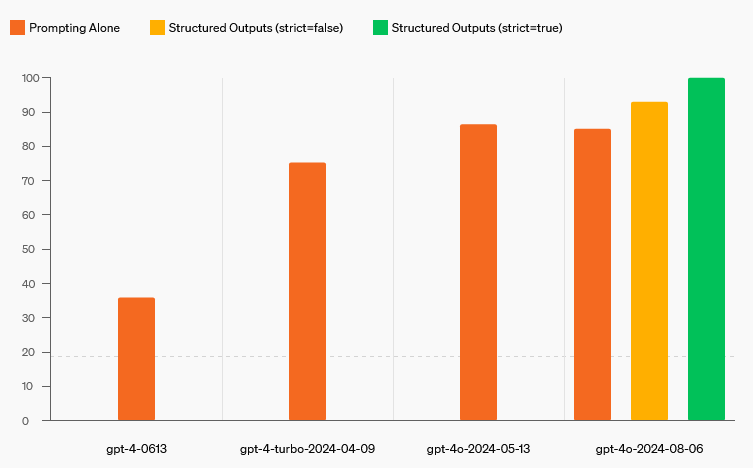 OpenAI 公司跟踪评估了复杂 JSON 模式,带有 构造化输出的新模型 gpt-4o-2024-08-06 获得了 100% 的满分;相比之下 gpt-4-0613 得分不到 40% 。