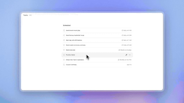 全部 使命均可在对话界面或网页版个人档案的 Tasks 专区进行治理,随时轻松 批改或 取缔已设置的 使命 。 使命 实现后,系统会通过网页端、桌面端和移动端向消费者推送 揭示 。