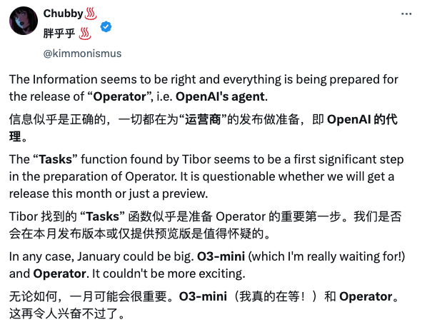 除了一片吐槽声,也有不少消费者猜测 Tasks 可能是 OpenAI Operator 的雏形 。X 消费者 @kimmonismus 就认为:「信息 仿佛是正确的, 所有都在为『Operator』的公布做 预备 。」