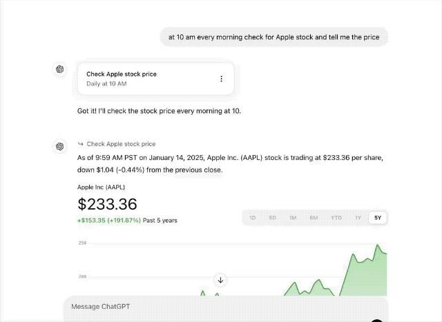 你 能够让 ChatGPT 天天查看股市行情,或是托付它定期在 ChatGPT Canvas 平台创作科幻故事,并将这些故事发送到你的邮箱里 。