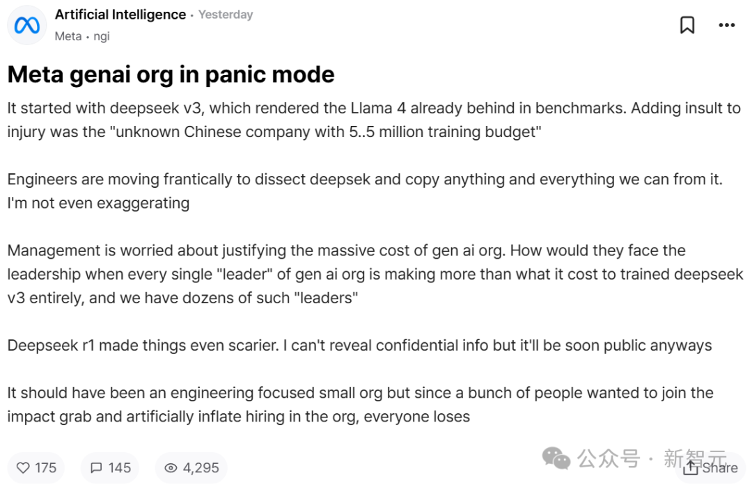 Meta 员工在 TeamBlind 爆料,点燃了一把火 。 自夸开源先锋的 Meta,直接被 DeepSeek 这家中国公司整得 汗颜无地 。不只工程师争分夺秒复现模型,年薪超过 DeepSeek 训练成本的高管们,心底也有点虚 。
