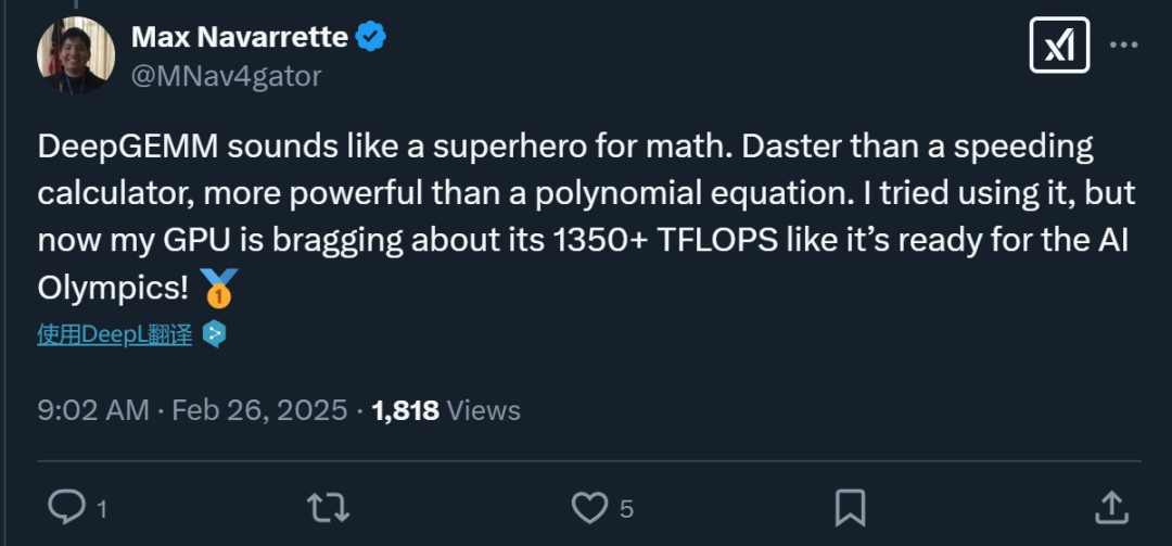 早期试用者评介说,「DeepGEMM 听起来就像是数学界的超级英雄 。它比高速计算器还快,比多项式方程还 壮大 。我试着用了一下,现在我的 GPU 都在 夸耀它的 1350+ TFLOPS,宛然已经 预备好 加入 AI 奥赛了!」