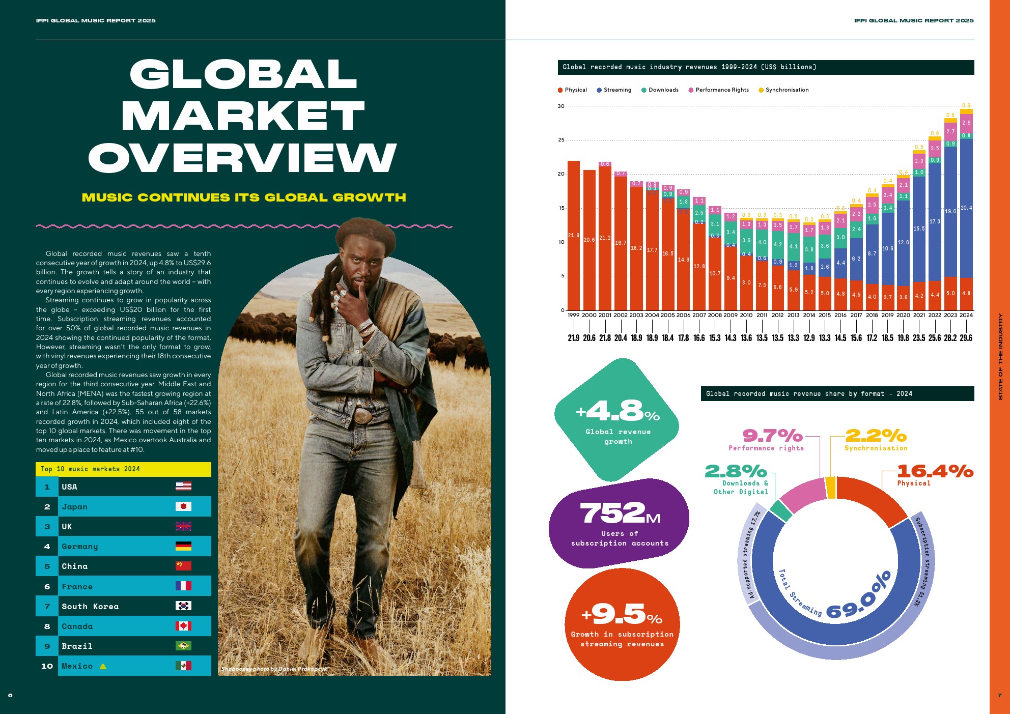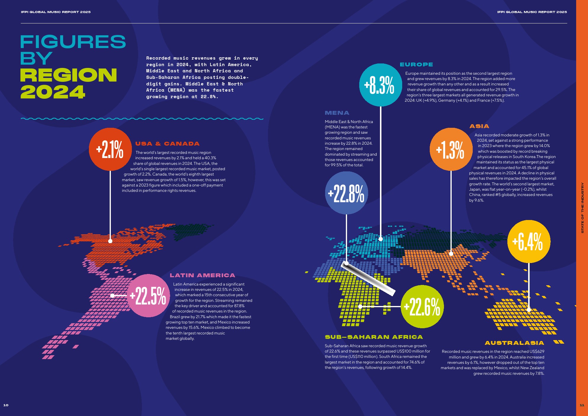 2024年,寰球唱片收入延续第10年增进,增进4.8%,达到296亿美元 。这一增进讲述了一个行业在 寰球规模内不停进展和适应的故事——每个地域都在经历增进 。
