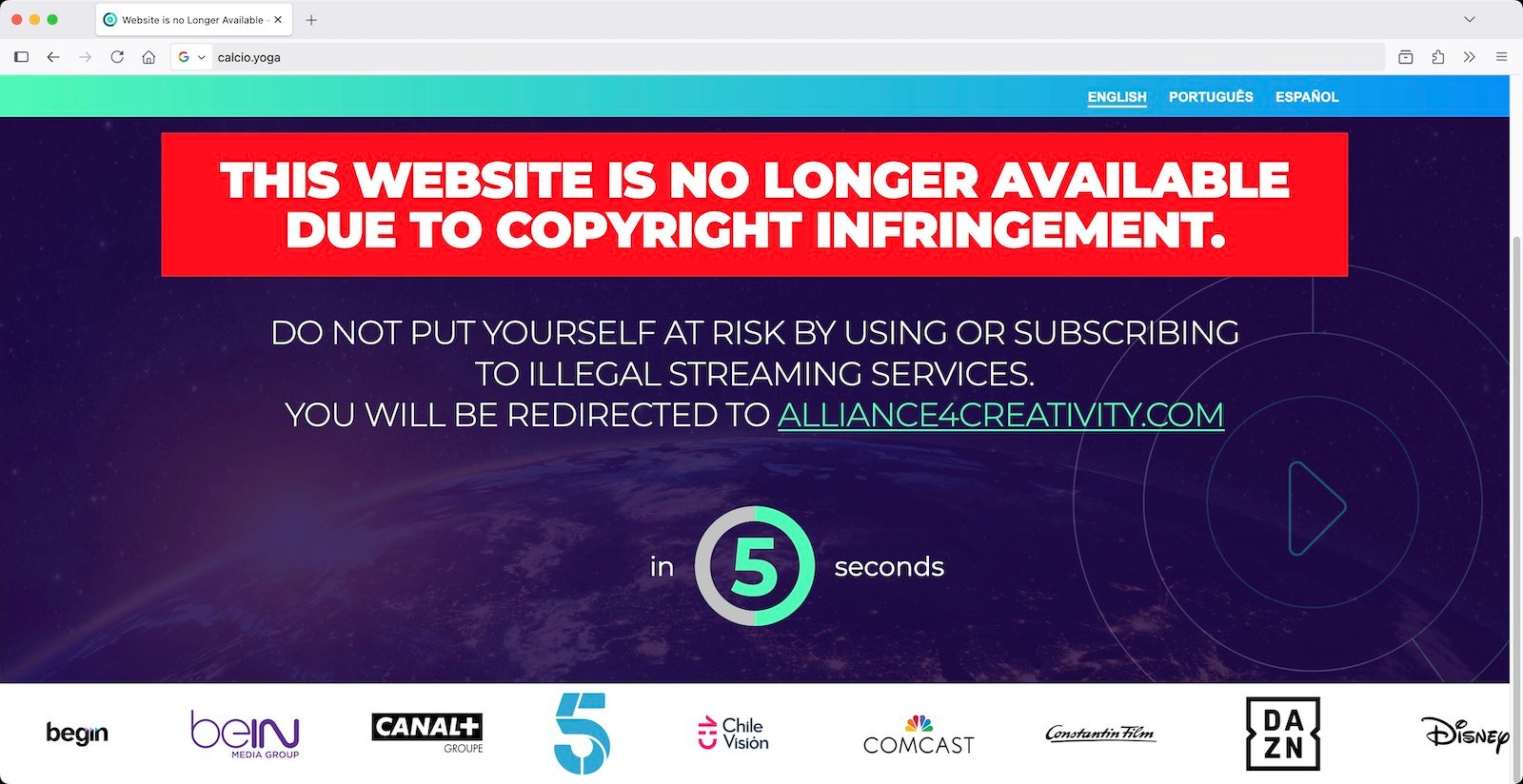 Calcio 经营者属于摩尔多瓦籍,在接触两大反盗版组织后,允许 永远关闭平台,并将所有域名移交 ACE,现已跳转至 ACE 的“Watch Legally”官网,鼓舞消费者通过合法渠道观看赛事 。